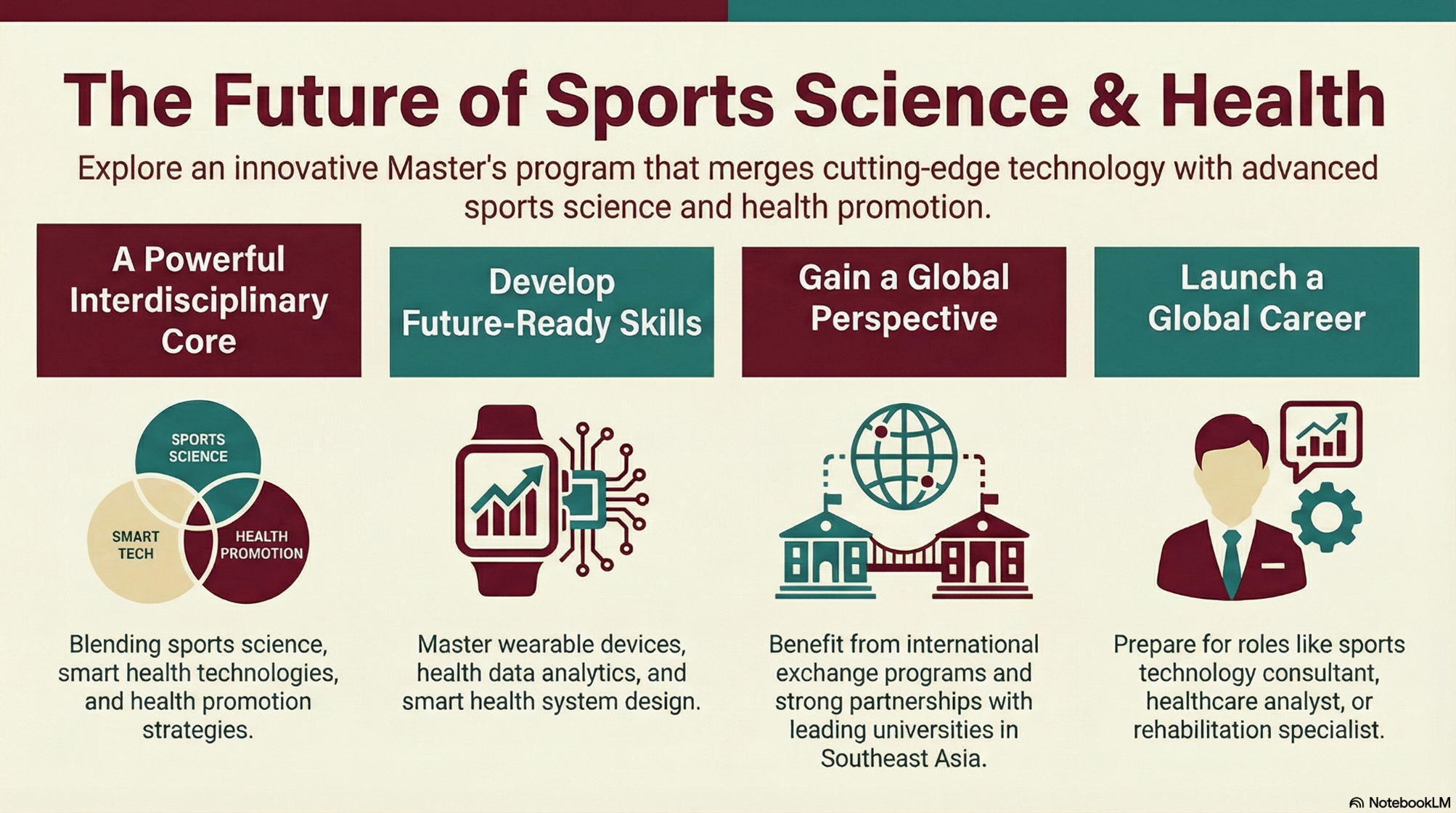 The Master of Science International Sport Science and Intelligent Health Program offers an exceptional platform for ambitious individuals ready to redefine the future of sports science and health innovation. With a focus on blending advanced technology, practical skills, and global perspectives, this program is your key to becoming a trailblazer in the field.
