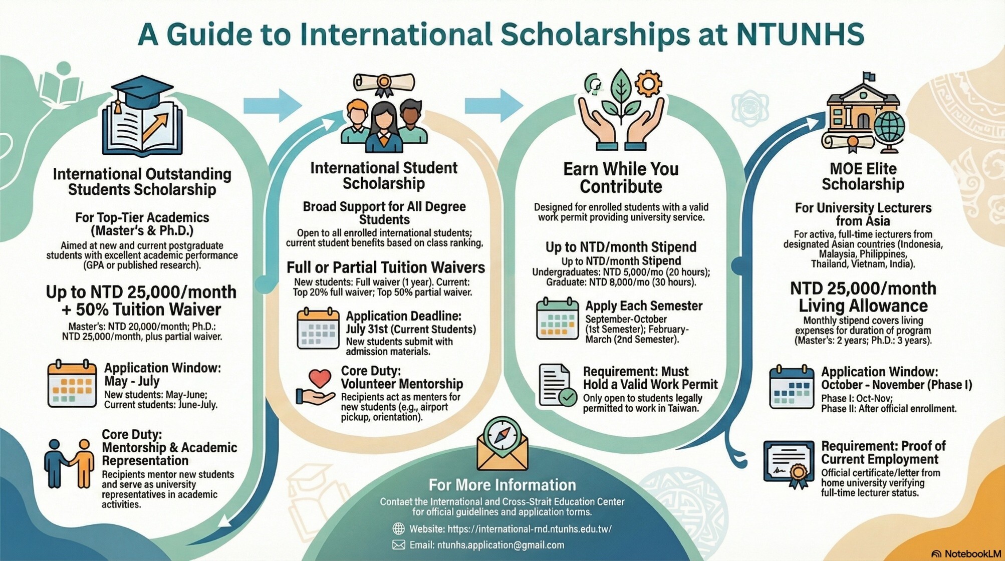 For further details, contact NTUNHS’s International and Cross-Strait Education Center or refer to the official application guidelines.