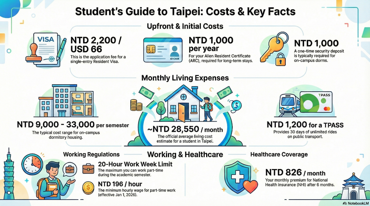 Taipei is a vibrant student city with convenient transport, strong healthcare support, and an excellent quality of life. As a reference, the Ministry of Education lists Taipei: NTD 28,550 per month as an average living cost estimate (actual spending varies by lifestyle).